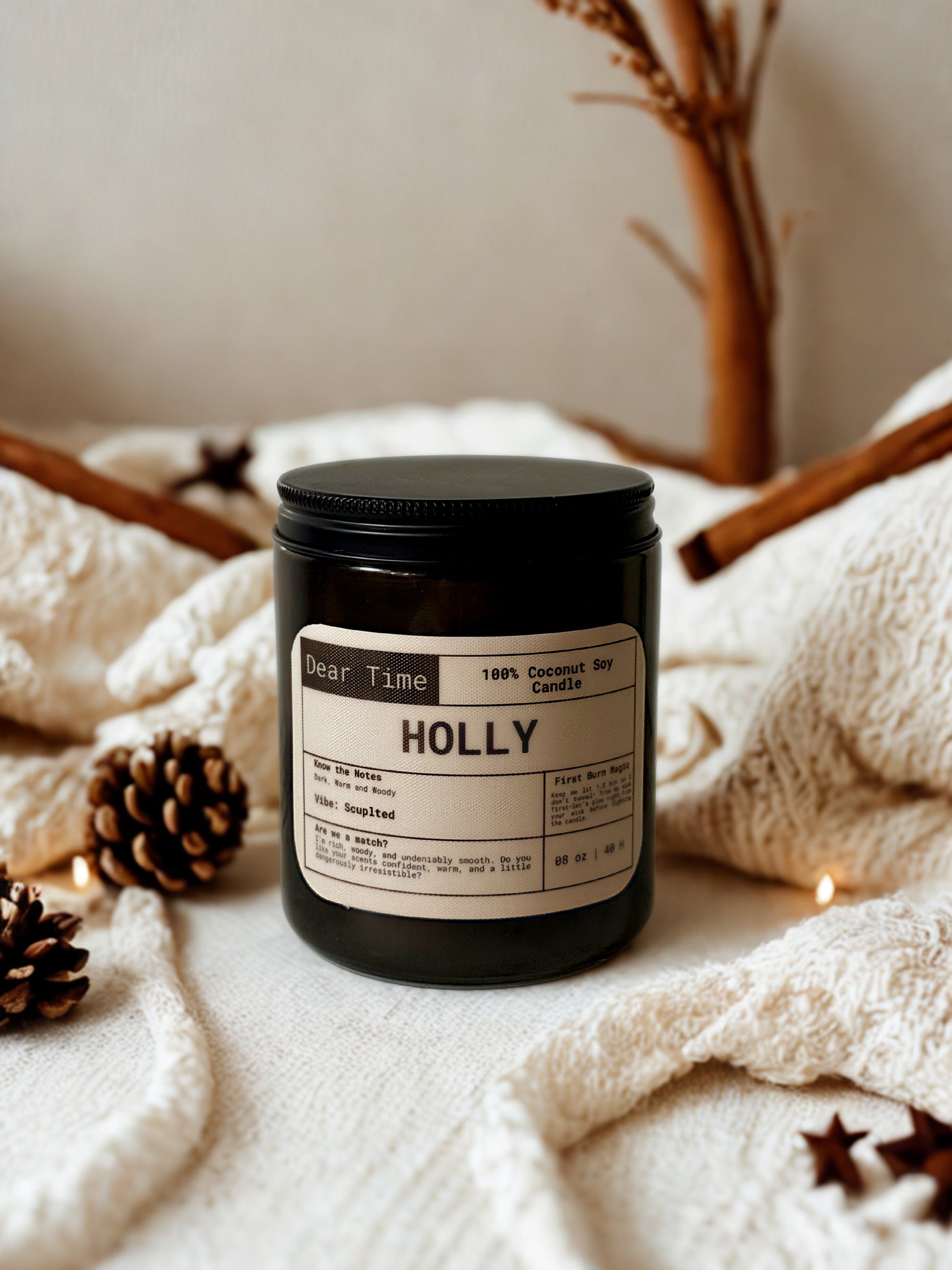 Holly is the candle that feels like stepping into a warm, elegant evening — rich, velvety, and quietly commanding. It opens with the deep glow of warm amber and smooth woods, creating an instant sense of comfort and sophistication. As it burns, layers of mysterious black hemlock and refined spice unfold, adding depth and intrigue. The scent settles into creamy vanilla and polished mahogany, wrapping the room in a cozy, luxurious warmth. Subtle, clean, never overpowering — Holly is your perfect blend of festive elegance and everyday allure.